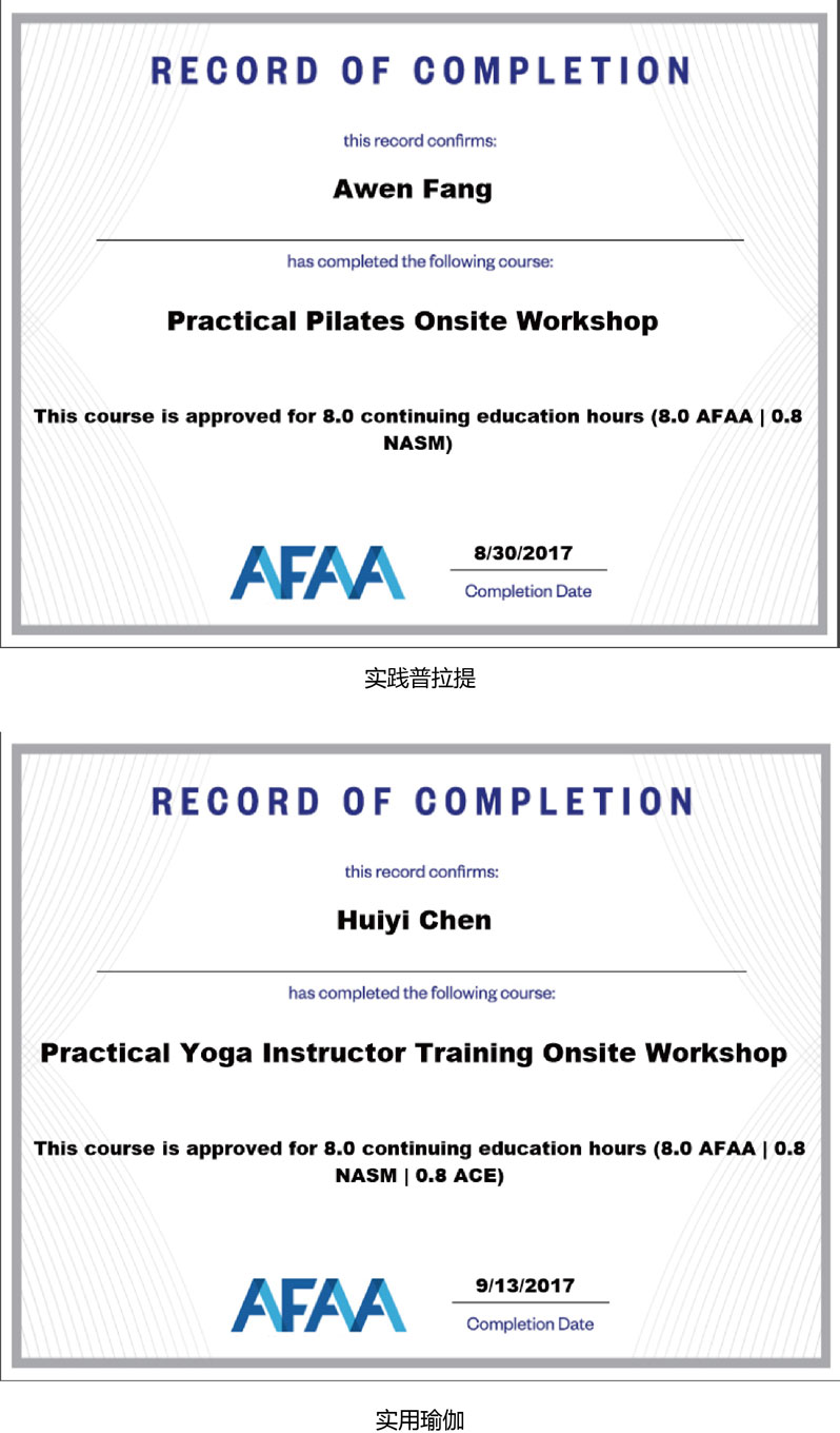 AFAA认证和专项课程证书模版一览