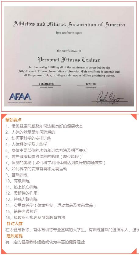 AFAA是“美国体育及体适能协会”( "Athletics and Fitness Association of America")的简称。简称。30多年来 AFAA 每年在美国境内的俱乐部与有氧教室举办超过35000场具教育意义的研讨会,并发展成为"世界最大体适能教育机构"及网络远程体适能(TeleFitness®)教育机 构。截至目前为止,在全球已有超过35万人取得 AFAA 核发之国际认证,并活跃于全世界80余个 国家体适能业界。AFAA 致力于为热爱体适能和体育事业的专业人士提供认证教育。AFAA 坚信改 变形体,可以让生活变得更美好。其专业队伍涵盖私教和团体体适能两个领域。AFAA 教练不仅 知道如何锻炼,还掌握实践技巧,科学理论和动手能力,以期有效激励和激发大家进行更加健 康快乐生活。 AFAA 是具有公信力且可信赖的教育机构,所有的检定考试及教育课程皆受相关单位认可。 AFAA 由远程教育及培训委员会(DETC)认可。DETC 为美国教育部所列权威认证机构。AFAA 也 获得高级教育认可委员会(CHEA)承认。AFAA 的认证考试由生命研究会(Vital Research)授 权。AFAA 是美国健身考试委员会(NBFE)及美国国家资格保证协会(NOCA)的联盟组织。 并满足IHRSA2005年提出的国际体适能教育认证机构建议指标。 作为全球体适能认证界的领军品牌,AFAA 创立并实践《安全体适能之基础运动 标准和指导纲要》